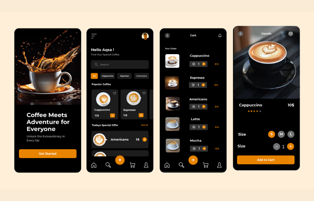A personal UI/UX design exploration for a modern coffee ordering mobile application. This project allowed me to focus on creating a rich, engaging Dark Mode interface and developing a seamless ordering flow. I designed high-fidelity screens, emphasizing visual hierarchy and effortless interaction, as a demonstration of my mobile design capabilities.