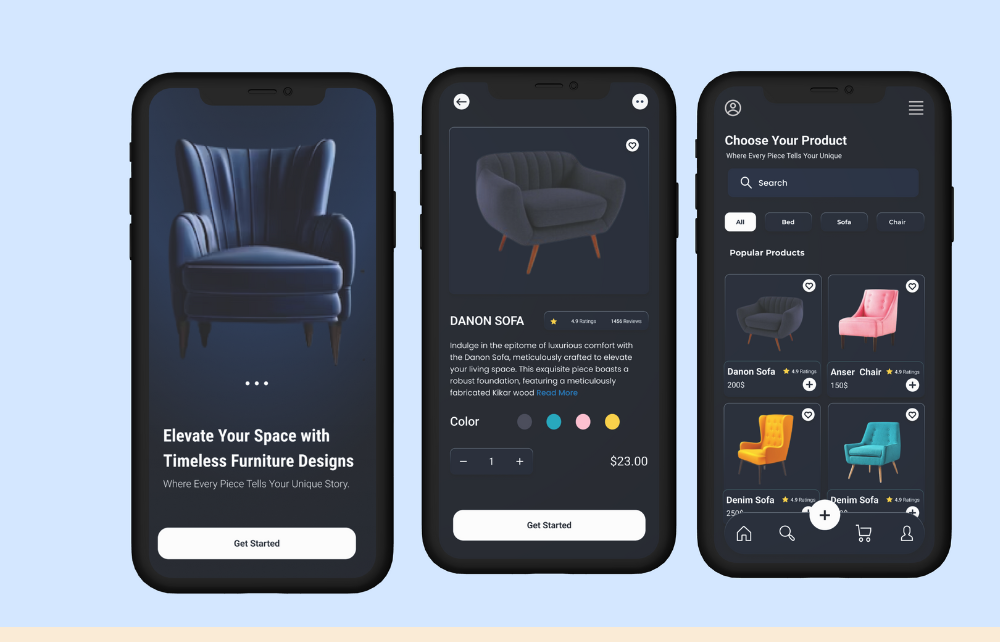 A personal UI/UX concept focused on elevating the online furniture shopping experience. I designed a visually rich Dark Mode interface with a focus on high-quality product visualization and a clean, intuitive navigation flow. This project demonstrates my ability to craft beautiful interfaces that simplify complex product catalogs.